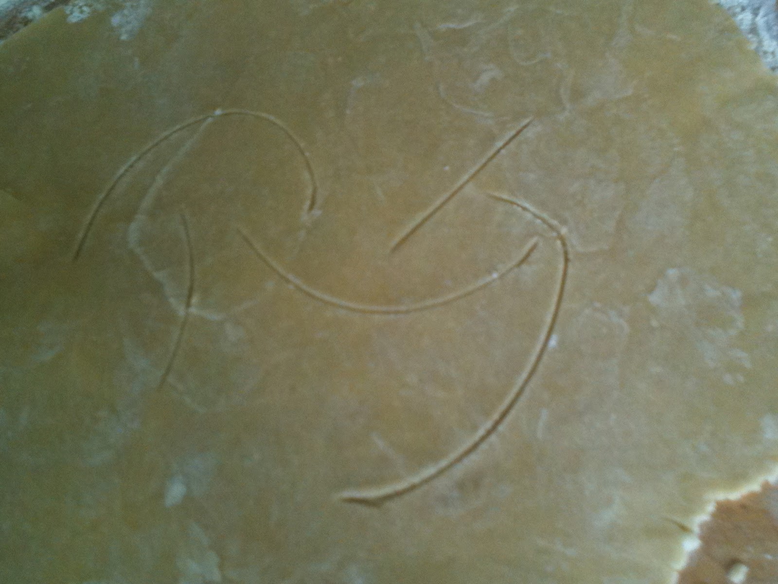 Roll out the top crust (using the other half of the pie crust (from above). Again, make sure that the diameter of the crust is 6-10 cm larger than the pie dish. You will need to cut in vent holes so the pie crust doesn't steam too much inside. Here we've made an R and a J for "rebarbora" and "jahoda" (rhubarb and strawberry)!