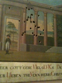 Another one shows the fashionable garb as the men dance about...But we kept asking ourselves why are there multiple bullet holes in every picture, often centered around the focal point or 'target' of the beautiful paintings? Was it from some peasant revolt? The German troops? Or.....??